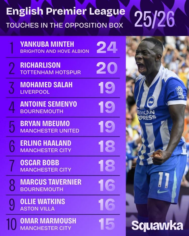 英超对方禁区触球榜:明特24次居首,理查利森次席&萨拉赫第三